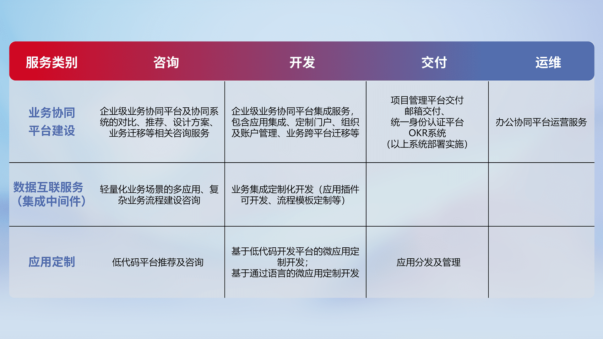 针对钉钉、、、、企微、、、IDaas等平台级产品提供产品的规划、、方案、、、交付、、、、定制化开发等服务,,,实现如统一协同办公、、、智能客户服务、、、混合会议管理、、、智能数据查询、、、等业务场景,,实现数字化转型。。