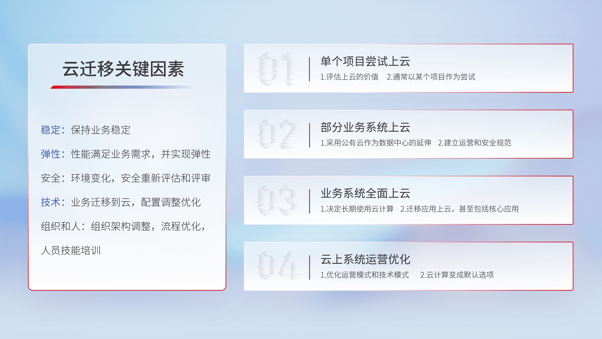 结合实际业务,,,从规划设计、、、云平台选型、、云原生改造、、数据迁移、、、集成交付,,,,迁移全过程为客户识别最佳上云路径,,,,做好风险识别管理,,,,设计网络架构、、、、身份权限、、、安全审计合规、、操作审计、、日志审计、、、、监控告警策略、、多站点容灾设计等,,,,对云上基础设施进行整体规划,,提升IT治理水平,,,,以满足弹性、、、高可用、、、、高性能的需求。。
