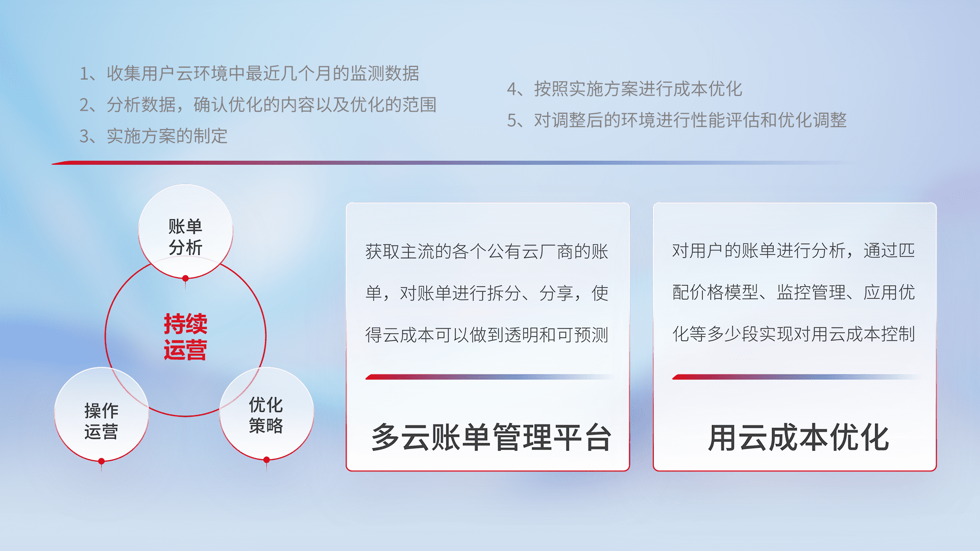 通过多云纳管,,,以统一的资源数据模型把客户的云资源进行抽象和封装,,,,进而实现对多云资源的统一操作,,保障云资源管理的可靠性、、稳定性与可用性。。。量身定制化运维内容,,,,配置、、开发运维、、、、补丁管理、、、、备份、、、、监控、、认证和访问管理、、审计和日常巡检等,,保障在用云过程中的可靠度,,稳定度以及高可用率。。。。